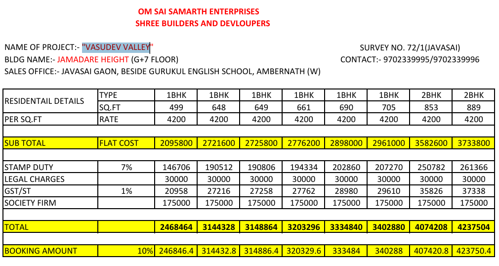 | Type | Sq.Ft | Flat Cost (₹) | Stamp Duty (7%) | Legal Charges (₹) | GST/ST (1%) | Society Firm (₹) | Total Cost (₹) | Booking Amount (10%) |
