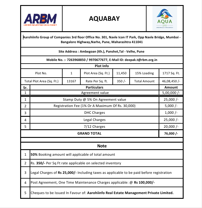 *Plot Area: 11,450 Sq. Ft. (with 15% Loading to 13,167 Sq. Ft.). Rate: ₹350 per Sq. Ft. Total Amount: ₹46,08,450. Note: Booking amount 50% of total amount. One Time Maintenance: ₹1,00,000.