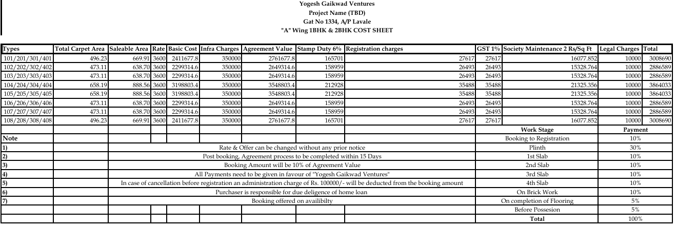 | Type | Carpet (Sq.Ft.) | Unit Price (₹) |