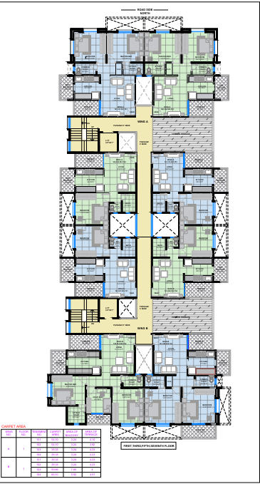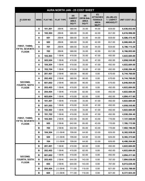 | Wing | Flat No. | Type | Carpet (Sq.Ft.) | Balcony + Terrace (Sq.Ft.) | Total (Sq.Ft.) | Unit Price (₹) |